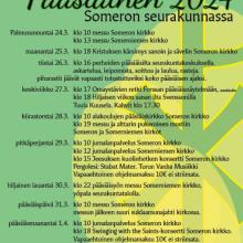 Someron seurakunna pääsiaisajan tapahtumat noudattelevat perinteistä kaavaa. Palmusunnuntain messussa  kello 10 Somerolla ovat mukana rippikoululaiset Perniö1-ryhmästä. Somerniemellä messu tavalliseen tapaan yhdeltä.