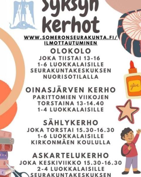 Oinasjärven kerho on joka parittoman viikon torstaina. Kerhossa on yhteistä tekemistä askartelun ja pelailun merkeissä. 1.-4. luokkalaisille. Kerho on osa Someron harrastamisen mallia.