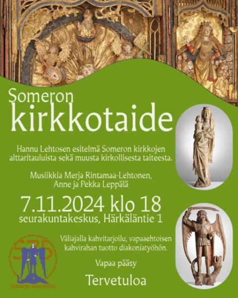Esitelmässä kuullaan lisäksi, miten Härkälän ja Lahden kartanot liittyvät somerolaiseen kirkkotaiteeseen. Samoin selviää, kuka ja missä nykyäänkin Someron seurakunnan tiloissa nähtävillä olevassa teoksessa pitää kädessään tikaria?