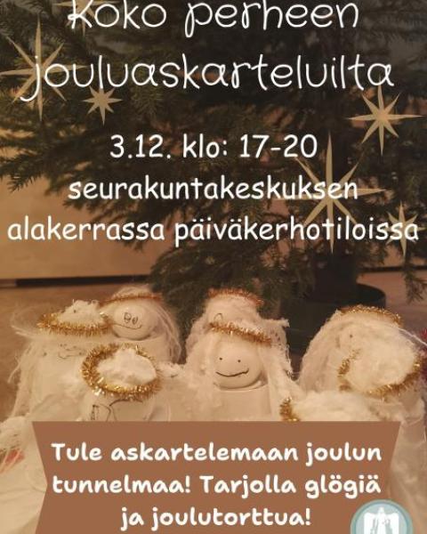 Koko perheen jouluaskarteluilta järjestetään tuttuun tapaan seurakuntakeskuksen päiväkerhotiloissa, keskuksen alakerrassa 3.12.2024 kello 17-20. Yhdessäoloa, joulumusiikkia, askartelua ja pientä purtavaa.
