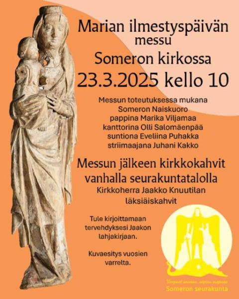 Keskellä paastonaikaa saamme kokoontua Marian ilmestymispäivänä hyväntuuliseen messuun, jossa on mukana Someron Naiskuoro, kanttori Salomäenpää sekä pastori Viljamaa.