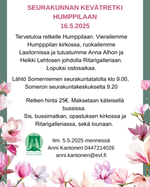Tervetuloa Someron seurakunnan yhteiselle kevätretkelle Humppilaan 16.5.2025. Vierailemme Humppilan kirkossa, ruokailemme Lasitornissa ja tutustumme Ritarigalleriaan. Lopuksi ostosaikaa.