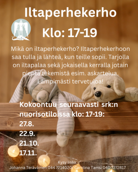 Syyskauden iltaperhekerho aloittaa kokoontumiset elokuussa 27.8.! Muut päivämäärät saatavilla mainoksesta. Ekalla kokoontumiskerralla mukana on myös Martti, joka pitää meille musiikkihetken. Tarjolla iltapalaa, askartelua sekä leppoisaa yhdessäoloa. Tulkaa mukaan koko perhe! Nähdään klo: 17-19 välisenä aikana nuorisotiloissa!
