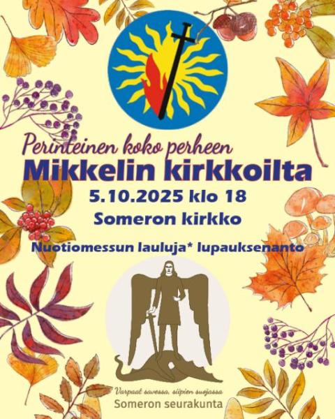 Perinteinen Mikkelin kirkkoilta sunnuntaina 5.10. kello 18 Someron kirkossa kokoaa yhteen partiolaiset perheineen ja kaikki muutkin Nuotiomessun lauluista nauttivat. Kirkkoillan aikana uudet partiolaiset antavat partiolupauksensa. Tanja Erkkilä, Nella-Mari Lindberg, partiolippukunta Marjatat ja Mikon Pojat, partiolaisten kuoro ja bändi takaavat partiohenkeä uhkuvan illan.