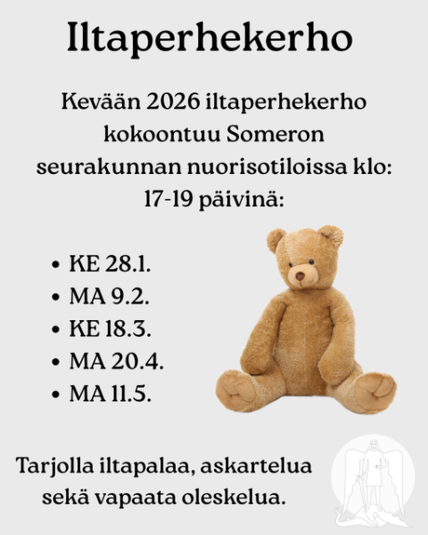 Tapahtuma-aika ja -paikka 28.1.2026 kello: 17-19 Nuorisotiloissa Ke, 28.01.2026 - 12:00 Iltaperhekerho aloittaa taas!