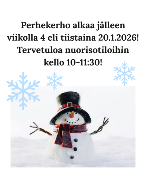 Tapahtuma-aika ja -paikka Tiistaina 20.1.2026 klo: 10-11:30 Nuorisotilat Ti, 20.01.2026 - 12:00 Perhekerho starttaa jälleen tammikuussa viikolla 4!