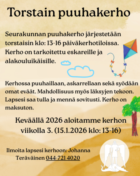 Tammikuussa 2026 alkaa seurakunnan päiväkerhotiloissa puuhakerho. Puuhakerho järjestetään torstaisin klo: 13-16 eskareille ja alakouluikäisille. Kerhossa puuhaillaan, askarrellaan sekä leikitään. Mahdollisuus myös läksyjen tekoon. Kerho on maksuton ja lapsesi saa tulla ja mennä sovitusti. Kerhossa syödään omat eväät. Ilmoita lapsesi mukaan: Johanna Teräväinen puh. +358 44 7214020
