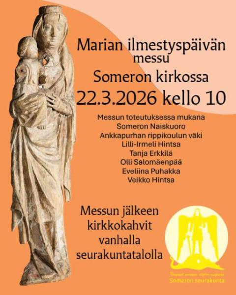 Marian ilmestyspäivän messu Someron kirkossa 22.3.2026 kello 10. Lilli-Irmeli Hintsa, Tanja Erkkilä. Olli Salomäenpää, Someron naiskuoro, Ankkapurhan rippikoululaiset, Eveliina Puhakka. Striimaamassa Veikko Hintsa.