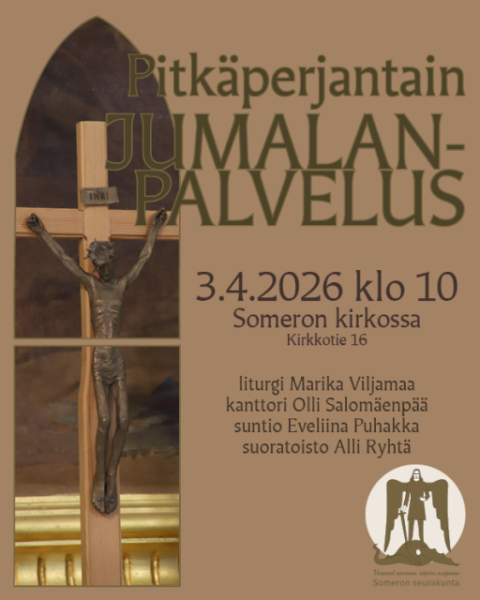 Pitkäperjantain jumalanpalvelus Someron kirkossa 3.4.2026 kello 10. Marika Viljamaa, Olli Salomäenpää, Eveliina Puhakka. Striimaamassa Alli Ryhtä.
